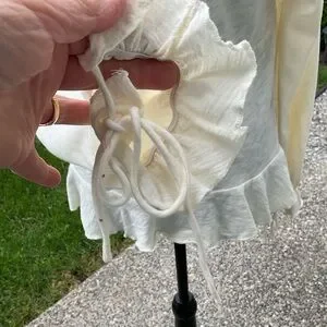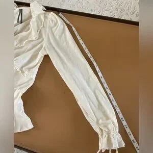 Soft cream blouse with ruffled V-neck and front ties. Long sleeves with elastic ruffle cuffs. Flowy hem with gentle peplum ruffle. Lightweight, feminine style for layering or standalone wear.