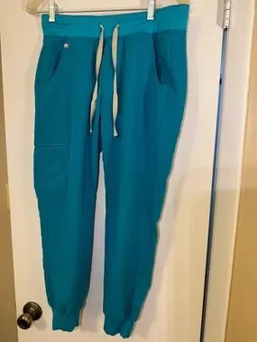 Comfortable drawstring joggers in a bright teal color. Elastic waistband with gray drawstring. Side pockets and a clean, simple silhouette. Figs brand size S/P