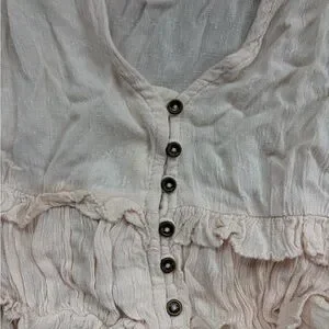 Chic cream blouse with button-down front. Features ruffled layers and lace accents.