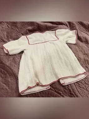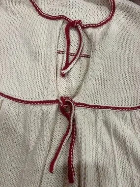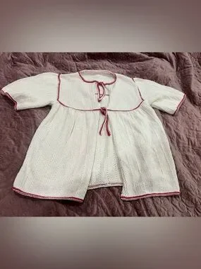 Soft cream knit cardigan with contrasting red trim. Short sleeves and tie front closure. Lightweight and classic style. Gentle knit texture. Handmade in great condition!