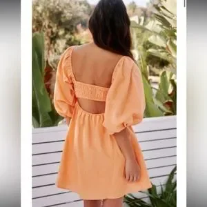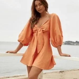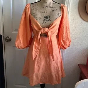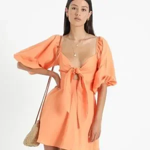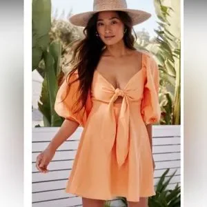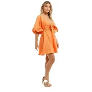 Channel your inner beach babe in this sweet and fun mini dress by Charlie Holiday. Voluminous sleeves balance the flirty hemline and front cutout, while the shirred back and tie front add dimension. Crafted from a lightweight fabric in a beautiful Papaya hue, this dress is a must-hire for an upcoming weekend getaway or summer party event!