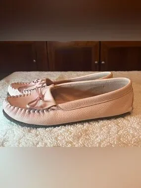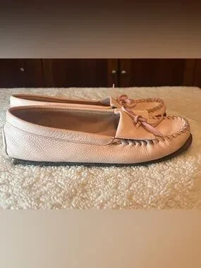Classic J.Crew leather driving moccasin loafers in a soft blush pink color. These comfortable slip-on flats feature a traditional moc toe with braided stitching and a decorative leather bow.