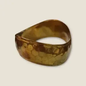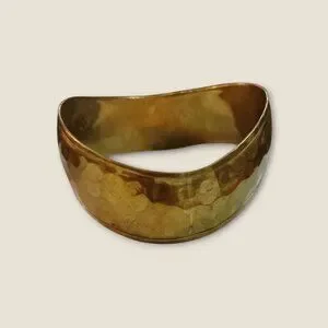 A unique brass bangle bracelet featuring a handcrafted hammered texture. Its 2.75" inside diameter and 1" width offer a bold yet elegant statement.