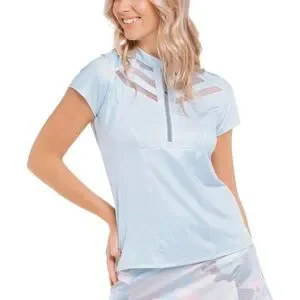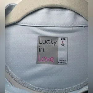 Lucky In Love Women’s Tennis Mesh Polo size Large. Light blue & white top. Quarter zipper. Great condition- looks new!