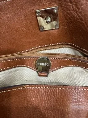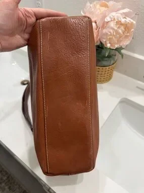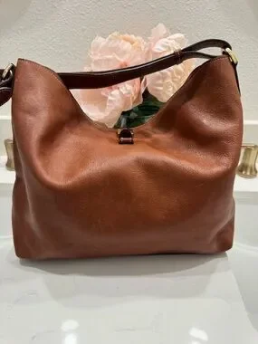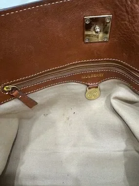 Pebbled brown leather with gold hardware. Mulberry bags are classic, timeless. This bag can be your daily carry with plenty of room all your needs and a comfortable shoulder strap. The front clasp keeps everything inside but easy enough to access items quickly when needed. This is a pre loved item in great condition. No call outs for the exterior, interior has minor stains. The interior is twill and can be cleaned.