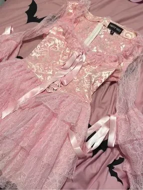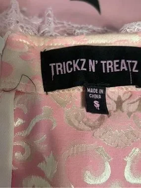 Dolls Kill Trick N Treats, size small, They’ll Eat Cake Marie Antoinette brocade dress. This beautiful dress was only worn twice, no damage, holes, or stains, there are a few loose threads here and there. This dress is really poofy as is but could be even more exaggerated with a nice fluffy petticoat under it! The ruffle bell sleeves have functional ribbon ties, and the back also has a zipper. This dress is super princessy and girlie, perfect for Valentine’s Day! I purchased this dress originally for $89 3+ years ago