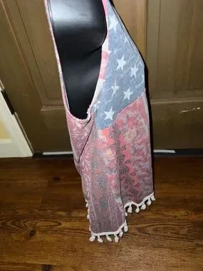 Sleeveless tank with Americana flag and boho stripe floral pattern. Soft pink red and faded blue multicolor designs and tones. Fringe tassel hem adds playful detail. Lightweight sleeves ft stretch fabric ideal for casual summer wear.