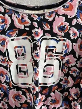 Maeve by Anthropologie floral graphic tee featuring a bold “86” front detail and sporty striped sleeves.