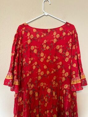 Bold, romantic, and effortlessly flowy—this Suzanne Betro maxi dress is a true statement piece. Featuring a vibrant red base with warm-toned floral prints and intricate border detailing, this dress brings major boho and cottagecore energy.