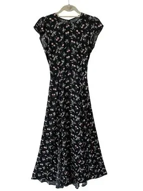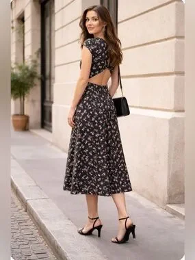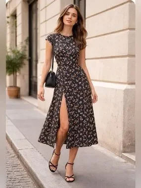 Keywords: Sustainable Fashion, Eco-Friendly, French Girl, Cottagecore, Whimsigoth, Dark Romance, Feminine, Ref-Girl, Minimalist, Romantic, Timeless, Classic, Bohemian, Chic, Dark Floral, Wedding Guest, Formal, Semi-Formal, Cocktail, Garden Party, Date Night, Engagement Photos, Rehearsal Dinner, Graduation, Spring Event, Summer Soiree, Vacation, Brunch, Holiday, Photo Shoot, Midi Length, Open Back, Cutout, High Slit, Thigh Slit, Cap Sleeve, Crew Neck, Slim Fit, Fit and Flare, Georgette, Crepe, Rayon, Viscose