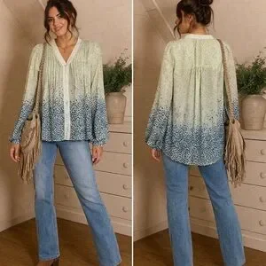 Beautiful boho-style blouse with delicate lace trim and pintuck detailing down the front. Soft sage green with a subtle floral print that fades into a darker pattern toward the bottom for a unique, elevated look.