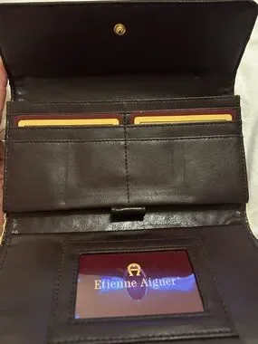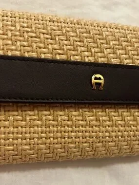 Vintage jute or natural, woven straw clutch, wallet, or wristlet. Gold Aigner logo accent on front leather trim. Slim, elegant silhouette for day or evening. Timeless, vintage, neutral palette pairs with many styles. New without tags. I have clipped on a wristlet strap in a lighter shade brown to make it a wristlet. Can be unclipped if preferred. Comes with new vintage matching keychain as well! Very boho and western cowgirl