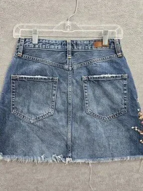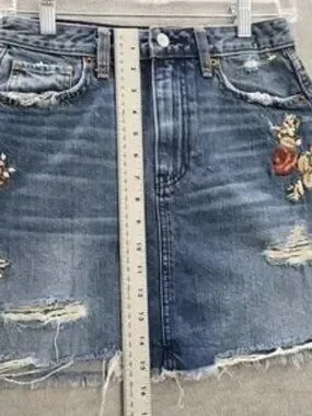 Abercrombie & Fitch Women Skirt 25 Blue Denim Floral Embroidery Mini Distressed