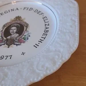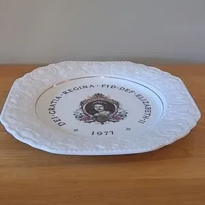 Beautiful creamy white squared commemorative plate by Lord Nelson Pottery to celebrate the 1977 Silver Jubilee of Her Majesty Queen Elizabeth II. Dei Gratia Regina Fid Def Elizabeth II 1977 ("By The Grace of God, Queen, Defender of the Faith Elizabeth II") with a portrait of the Queen is on the center of the plate with a beautiful embossed detailed edge.