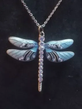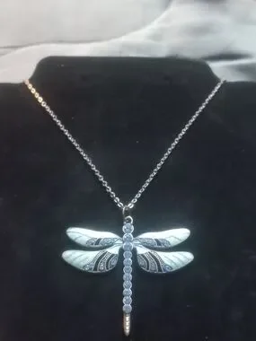 Hand Crafted Silver Dragonfly Necklace with Light Blue Accents
