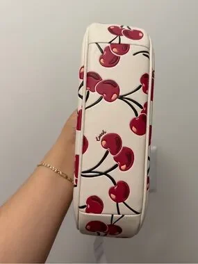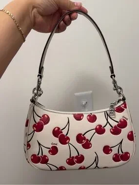 Coach Teri shoulder bag in white leather with a red cherry pattern. Silver-tone hardware.