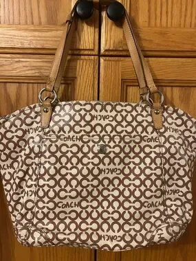 Coach shoulder tote with allover logo pattern. Front flap pocket with turn-lock closure. Leather-trimmed straps for comfortable carry. Silver-tone hardware. Versatile everyday design.