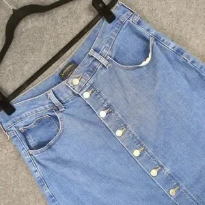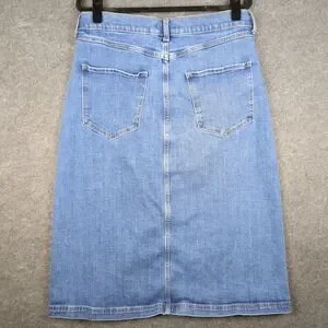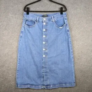 Keywords: denim skirt, button front, midi length, classic, wardrobe staple, casual wear, workwear, versatile, cotton blend, jeans skirt, high rise, a line