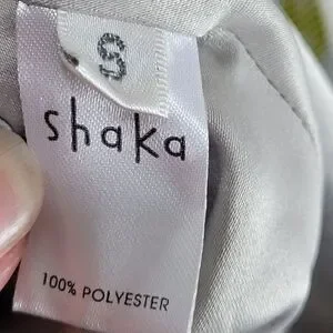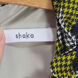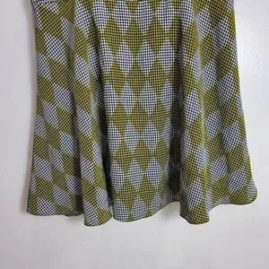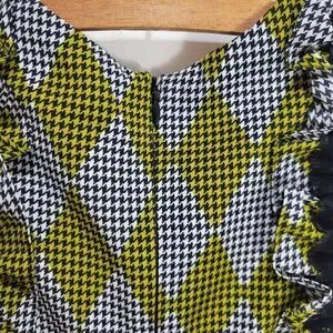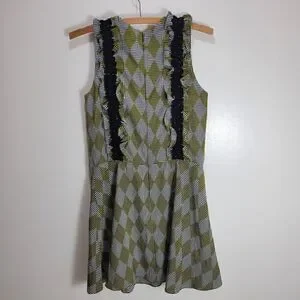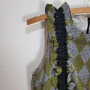 Swanky fit and flare dress from Shaka with a cool mini black and white houdstooth pattern and chartreuse yellowy green harlequin diamonds. Frill and black velour trim runs shoulder to waist front and back, sort of like a snazzy braces effect. Fully lined. Long rear zipper closure.