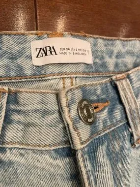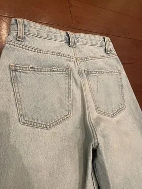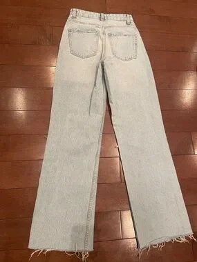 Zara straight leg jeans in a light blue wash. Features knee rips and subtle distressing. Raw hem for an effortless, casual vibe. Versatile pair for everyday outfits.