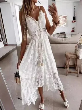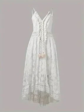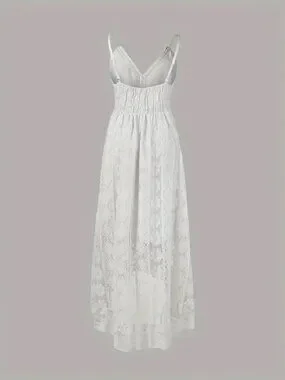 Women's Crochet Lace Maxi Dress Spaghetti Strap V Neck Cami Beach Boho Sundress