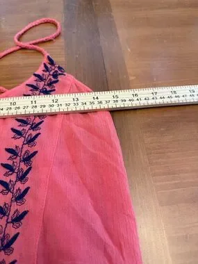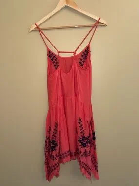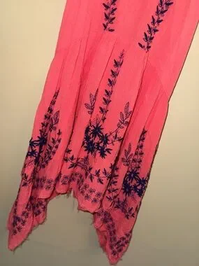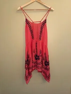 Lightweight coral swing dress with navy floral embroidery. Spaghetti straps and a flowy handkerchief hem. Easy, breezy summer style.