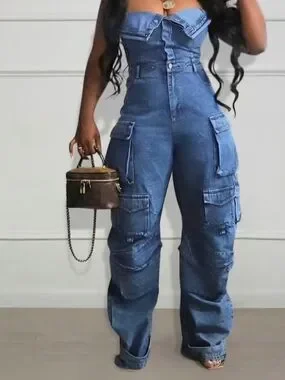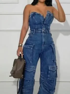 Turn heads in this bold and fashion-forward denim cargo jumpsuit. Designed with a structured strapless bodice and wide-leg silhouette, this piece blends edgy utility style with feminine shape.
