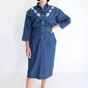Channel your inner cowgirl with the Vintage Tobi Dark Wash Button-Up Western Denim Midi Dress. This classic piece features a rich dark wash denim with a structured, button-up front and subtle western detailing, including stud accents that add a touch of rugged charm. The midi length and fitted waist create a flattering silhouette, perfect for transitioning from day to night.