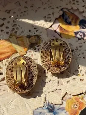 🐞Incredible bezel set cinnabar earrings - carved cinnabar set in filigree gold tone clip earrings