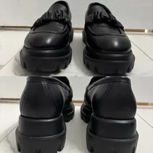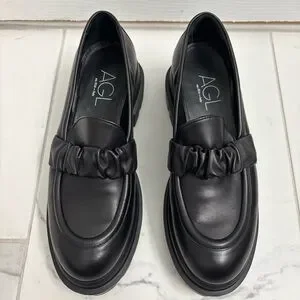 Celeste chunky-sole loafers from AGL featuring jet black, calf leather, almond toe, ruched detailing, slip-on style and chunky rubber sole.