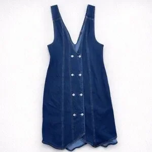 Keywords: denim dress, sleeveless dress, button front dress, v neck dress, dark wash dress, casual dress, womens fashion, tulip hem dress, contemporary dress, blue denim dress, summer dress, trendy dress