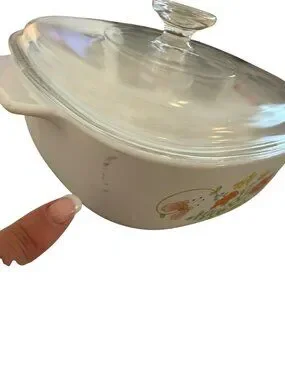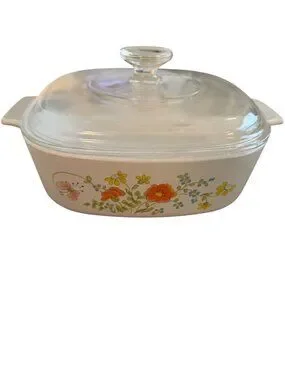 This is a 2 quart Corning Ware square casserole dish A-2-B with the original glass lid, in the Wildflower pattern. It is an A series casserole made of pyroceram (high heat glass made by Pyrex) and was produced during the years 1977 - 1986.