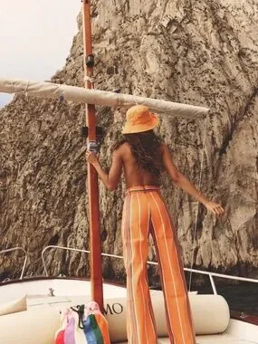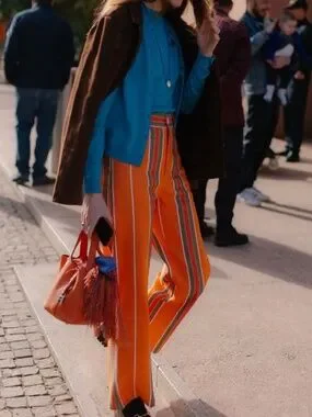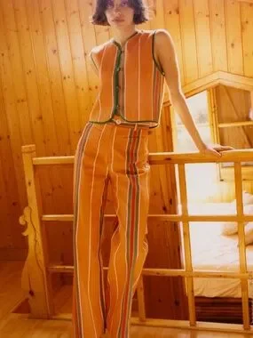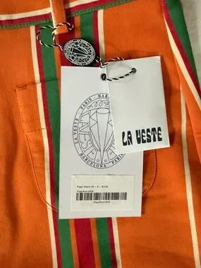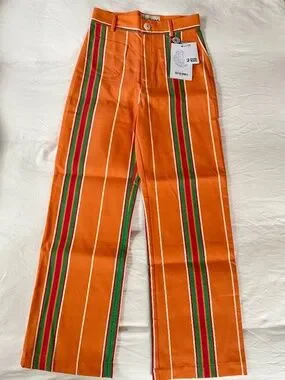 Orange high-waisted printed trousers in cotton with red and green stripes.