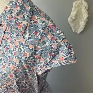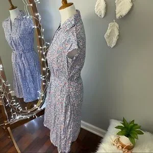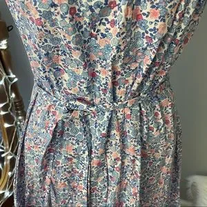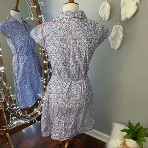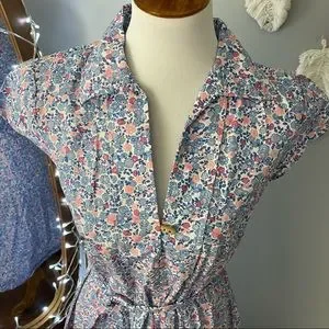 Lovely dainty floral dress by Kacey Hughes. Cotton pullover shirt dress with cap sleeves and removable tie at waist. Cute little button detail. Flared skirt. Excellent condition. Bust flat 18.5”. Waist 17.5”. Length 39”. First photo for styling purposes