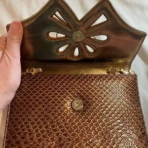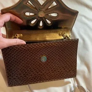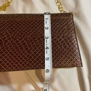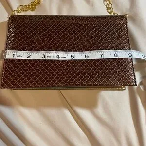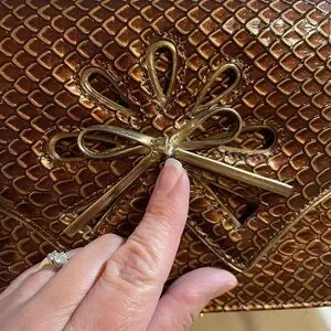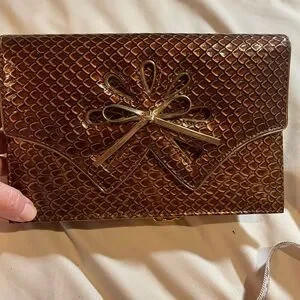 This elegant clutch from Bellini showcases a luxurious dark gold textured design, complete with a chic bright gold-tone chain and bow detail. Its compact size and sophisticated style make it an ideal accessory for formal occasions. *Bow has a tiny white dot in the center as pictured. Might be glue used for design? Not really noticeable when using clutch. Good condition! OS.