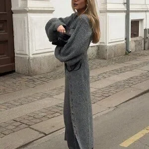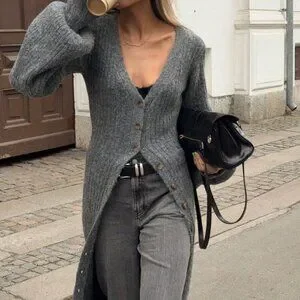 A dark grey casual cardigan offers a relaxed silhouette with a deep V‑neck and regular fit that drapes comfortably to a midi length. The regular sleeves provide easy movement, while the clean design keeps the look understated and versatile for everyday layering. Ideal for pairing with jeans, skirts or tailored pieces, this piece adds subtle texture without extra details.