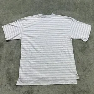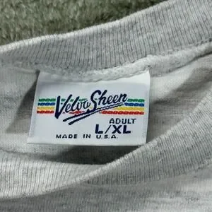 SEE PICS!!! NOT PERFECT!!! SEE PICS!!! This Vintage Men's T-shirt from Velva Sheen features a classic grey and white stripe design, perfect for adding a retro touch to any outfit. Made of soft cotton material, this original piece from the 1990s is a unique find for collectors or those looking for a timeless addition to their wardrobe. Proudly made in the United States, this t-shirt exudes quality craftsmanship and a vintage vibe that is sure to stand out.