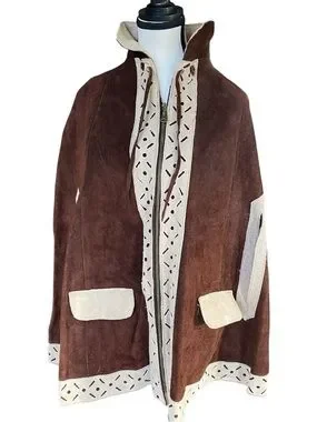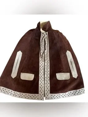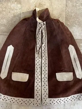 Stylish brown suede cape coat with decorative cream trim. Soft suede exterior with laser-cut cream accents for a vintage-inspired look. Open-front cape silhouette with practical side pockets