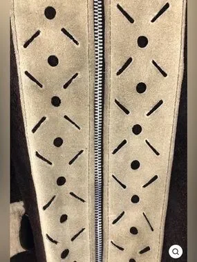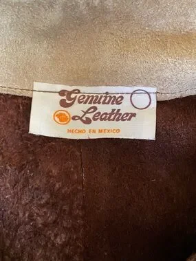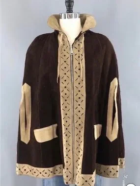 Vintage 1970s cape poncho jacket in two tone brown and tan genuine suede leather. Perforated design down the front and at the hem. Front metal zipper. Not lined. Very heavy weight leather/suede.