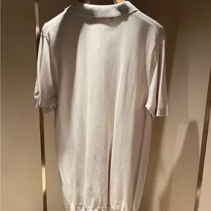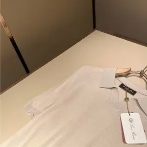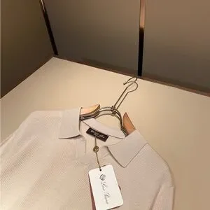 Loro Piana short-sleeve polo in a soft cream knit. Light graycontrast collar and cuff details. Refined, minimal silhouettewith subtle texture. Elegant casual piece for polishedeveryday wear.