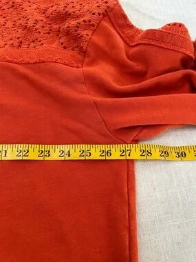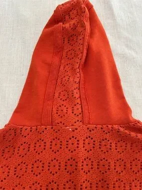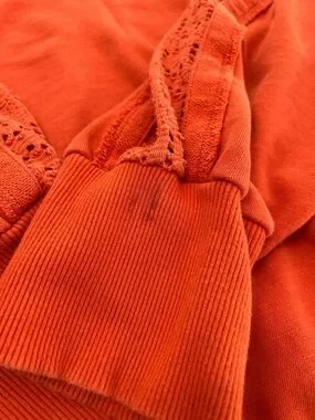 Daily Practice by Anthropologie Robyn Crocheted Hoodie in vibrant orange. Beautiful eyelet detail with a slouchy comfy fit. Small discoloration on sleeve but hardly noticeable.