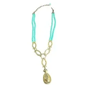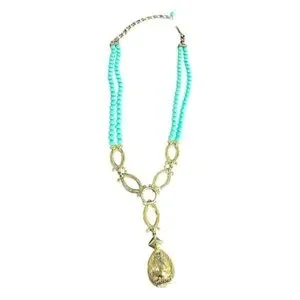 The necklace features a bohemian or Southwestern aesthetic with vibrant turquoise-colored beads and a statement drop pendant that includes a large coral-colored stone and crystal-encrusted elements.