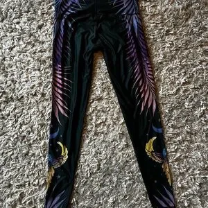 Leggings by teeki. They’re a deep green with bold designs on the sides. Only worn a handful of times, they are in excellent condition.