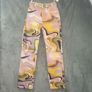 Zara Multicolor Denim Straight Jeans with Psychedelic Abstract Swirl print Sz 2