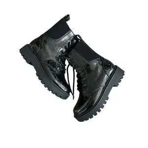 Step out in style with these dazzling black patent glitter combat boots. Featuring a trendy chunky lug sole and convenient lace-up closure, these boots offer both fashion and function.