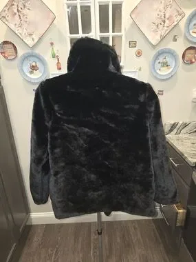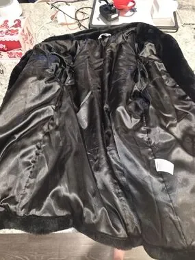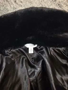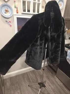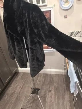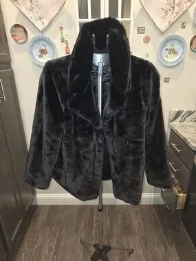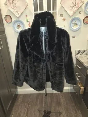 Soft faux fur teddy jacket in rich black. Classic collar and open front for easy layering. Plush texture adds warmth and elevated style. Versatile piece for casual or dressy looks.