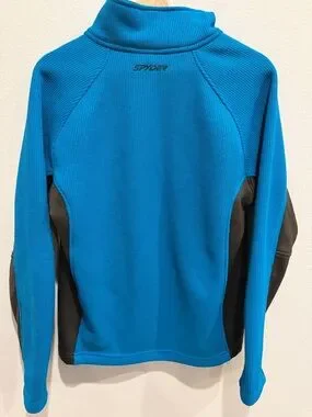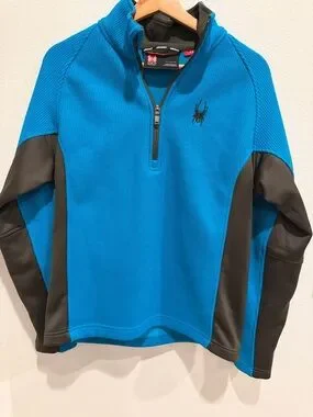 Lightweight performance sweater with short quarter-zip. Breathable textured turquoise body. Black contrast side panels and sleeves. Stand collar and elastic cuffs for fit. Small Spyder logo on chest.