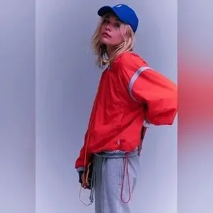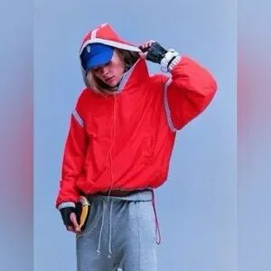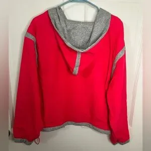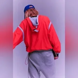 Lightweight red/hot pink (electric sunset) pullover windbreaker with contrast trim. Relaxed/Oversized fit with elastic cuffs and drawcord hem. Sporty style ideal for layering and movement.