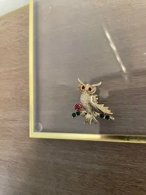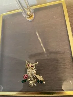 Gold-tone owl brooch by Artisan. Features pink and green glass stones. Detailed textured body and feather accents. Secure pin back for wear.