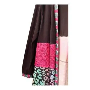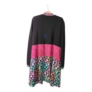 This fun and stylish longline cardigan from Southern Stitched Boutique is a showstopper! It features a mix of bold patterns with a black top, a vibrant pink floral design in the middle, and multicolored leopard print at the bottom. The cardigan is lightweight, soft, and has a relaxed fit, perfect for layering. The collar and trim add an extra pop with a contrasting floral design.